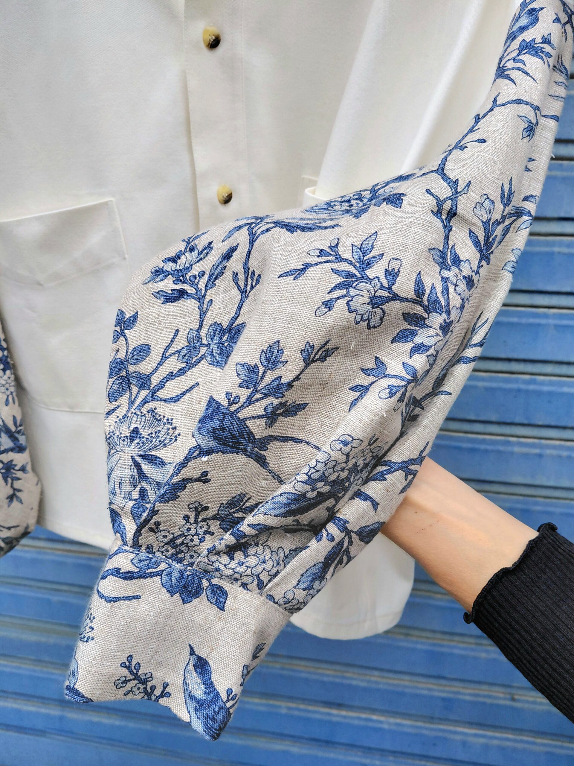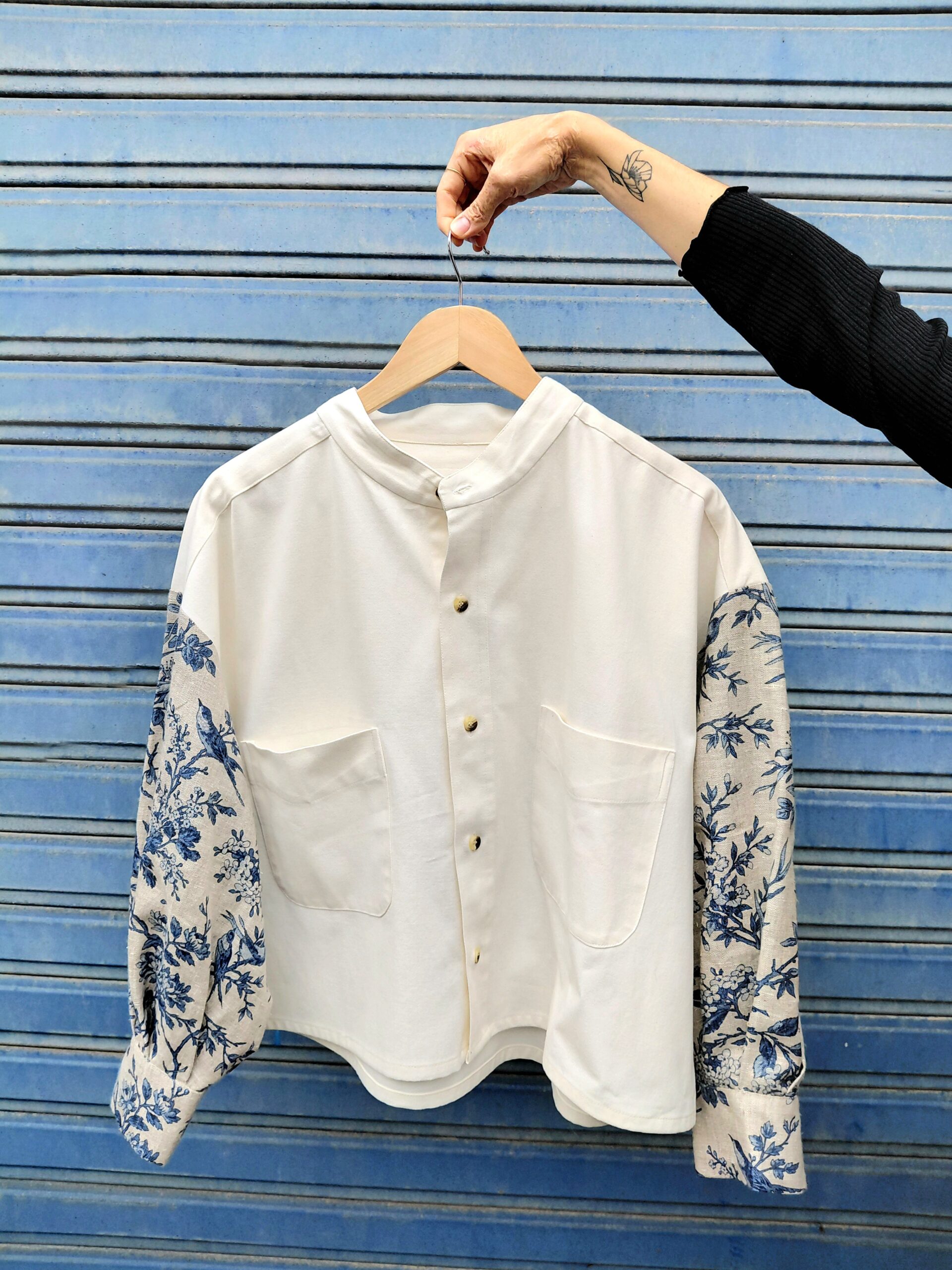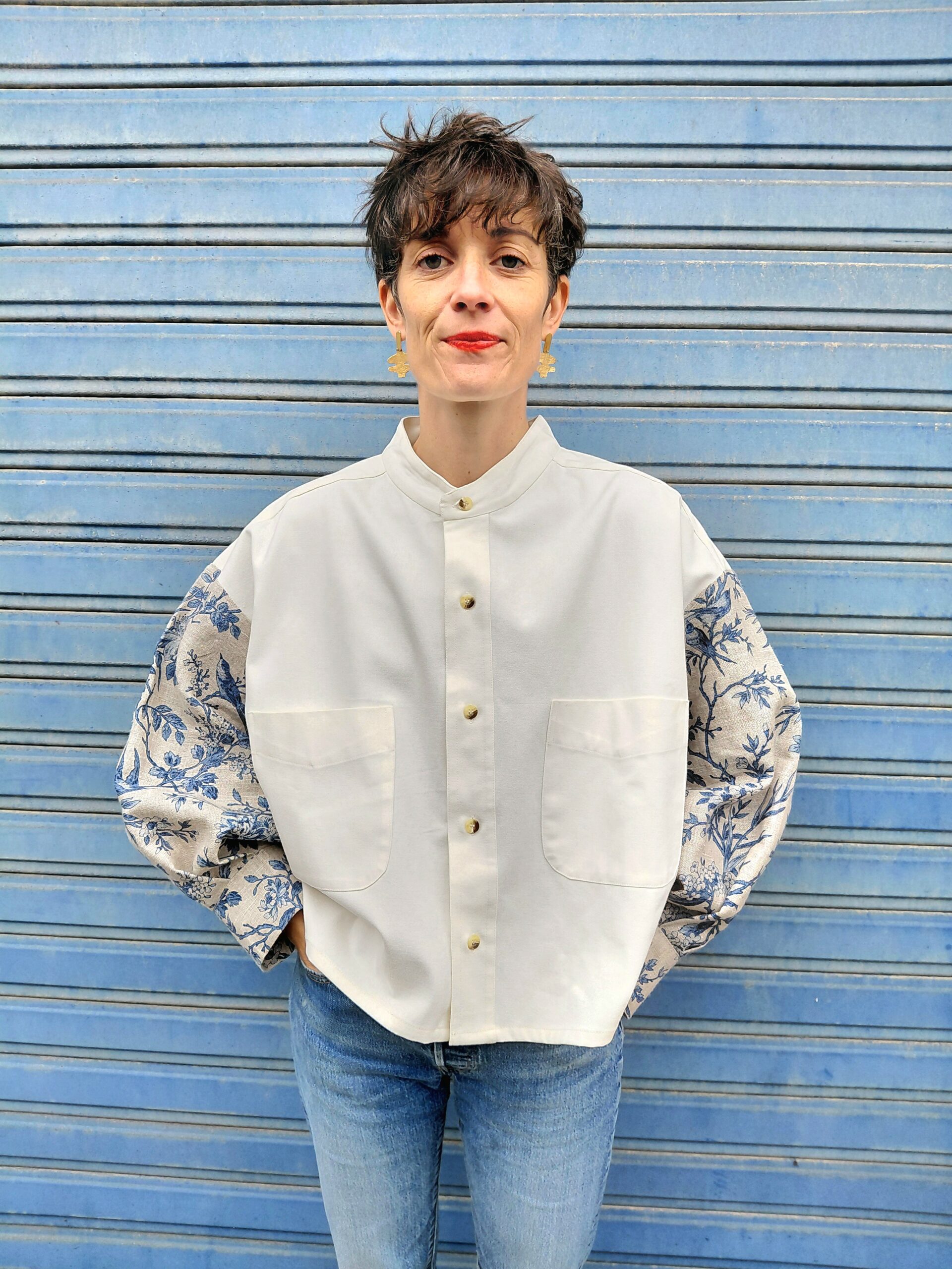 Tu choisis TON PROPRE TISSUS que tu m’envoies pour les manches. (80 cm x 140 cm). Je te confectionne ta sur-chemise personnalisée !
